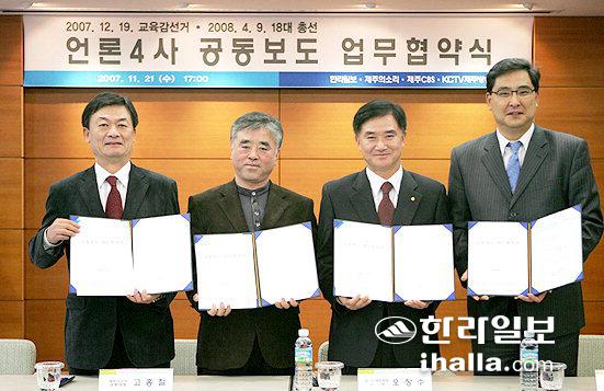 한라일보사 강만생 사장을 비롯한 KCTV제주방송 오창수 사장, 제주CBS 문영기 본부장, 제주의 소리 고홍철 대표는 21일 KCTV제주방송에서 오는 12월19일 치러지는 제주특별자치도 교육감선거와 내년 4월9일 제18대 국회의원 선거와 관련, 토론회와 여론조사 등에 따른 상호간의 협력과 공동보도를 위해 업무협약을 체결했다.