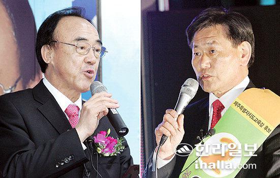 ▲제13대 제주특별자치도 교육감선거에 출마한 신영근 후보(사진 왼쪽)와 양성언 후보는 27일 각각 출정식을 갖고 본격적인 선거전에 뛰어 들었다. 신영근 후보와 양성언 후보가 출정식에서 출마의 변을 밝히고 있다. /사진=강경민 기자