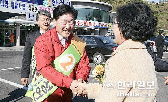 ▲7일 서귀포시에서 양성언 후보가 유권자들에게 지지를 호소하고 있다. /사진=이승철기자