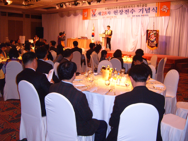 국제와이즈멘 제주클럽 창립 28주년 기념식에서 참된봉사클럽으로 거듭날것을 강조하는 김태윤회장의 모습