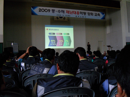 제주특별자치도 동부소방서(서장 이성훈)은 25일 오후4시~6시까지 구좌읍 김녕리 구좌 체육관에서 동부소방서 의용소방대원 450여명이 참석한 가운데 장마.태풍등 내습 시 대응요령 및 의용 소방대원이 갖추어야 할 전문 소양교육등 2009 풍.수해 대비 의용소방대원 정기 교육을 실시했다.