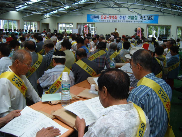 대한노인회 제주시회는 이날 제1회 전국 어린이 안전지킴이 금상수상보고회와 아울러 어린이 유괴 ․ 성범죄 추방 국민운동본부 제주시지회 명의로 어린이 유괴 성범죄 추방운동 여름철 촉진대회를 갖고 어린이 밝은 미래를 노인들이 지켜나갈 것을 다짐했다.