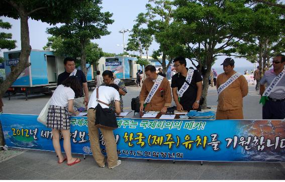 제주특별자치도연합청년회(회장 강영식)는 지난 7월 17일~18일 부산과 경북지역 일원에서 제주특별자치도연합청년회와 자매결연을 맺고 있는 (사)부산광역시청년연합회, (사)경상북도청년연합회의 협조를 얻어 2012년 제5차 세계자연보전총회 제주유치를 염원하는 범국민 서명운동을 전개했다.