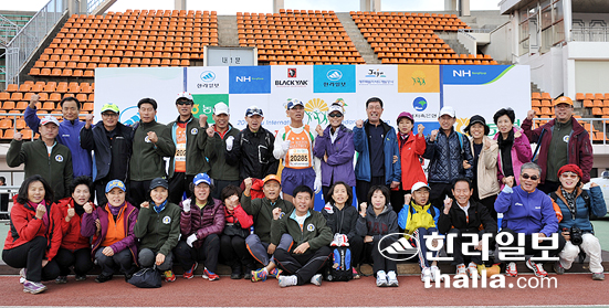 | ▲이번 대회로 50번째 풀코스 완주를 기록한 이성천씨. 이씨가 소속된 서귀포마라톤클럽이 그의 도전을 축하하며 함께 동행했다. /사진=특별취재팀 |