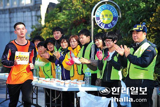 ▲자원봉사자들이 급수대에서 환호하며 선수들을 격려하고 있다. /사진=특별취재반