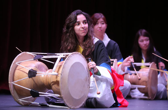 26일 서울 종로구 삼청로 국립민속박물관에서 열린 외국인 전통연희교실 발표회에서 광운대학교 외국인 학생들이 장구를 치고 있다. 연합뉴스