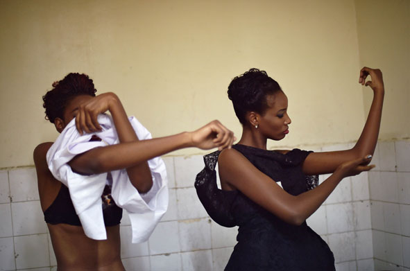 모델들이 28일(현지시간) 케냐의 수도 나이로비에서 열린 나이로비 패션주간 행사에 앞서 무대 뒤에서 옷을 입고 있다. 연합뉴스