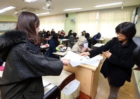 2015학년도 대학수학능력시험 성적표가 배부된 3일 오전 서울 서초구 서초고등학교에서 수험생들이 담임선생님으로부터 성적표를 받고 있다. 연합뉴스