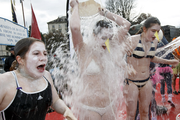 스위스 제네바 호수에서 14일(현지시간) 열린 제76회 크리스마스 수영대회에서 참가자들이 물로 뛰어들기 전 몸에 물을 끼얹고 있다. 이날 참가자들은 남녀 합해 모두 1천500명이 넘었는데 찬 제네바 호수에서 120m를 유영하며 즐거운 시간을 가졌다고. 연합뉴스