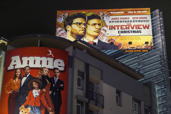 영화제작사 소니 픽처스는 김정은 북한 국방위원회 제1위원장의 암살을 소재로 한 미국 코미디 영화 '인터뷰' 의 개봉을 취소한다고 17일(현지시간) 전격 발표했다. 소니 측은 '인터뷰' 개봉과 관련해 테러위협이 제기되고 대다수 극장업체가 영화를 상영하지 않기로 결정함에 따라 25일로 예정됐던 이 영화 개봉을 포기하게 됐다고 밝혔다. 사진은 미 로스앤젤레스 할리우드 거리에 설치돼 있는 '인터뷰' 광고판. 연합뉴스