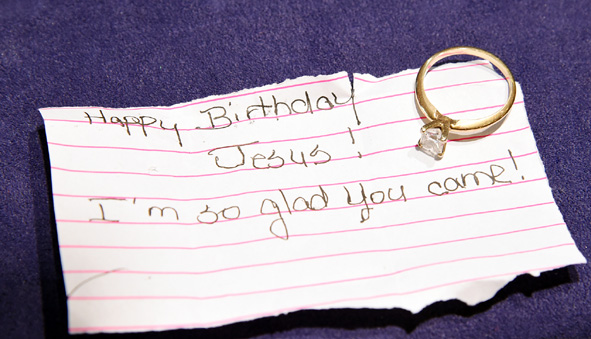18일(현지시간) 미국 노스캐롤라이나주 제임스타운의 로워스 슈퍼마켓 앞 구세군 자선냄비에 한 '천사'가 1캐럿 다이아몬드 약혼반지와 함께 남기고 간 메모. "예수님 탄생 정말 기뻐요" 연합뉴스