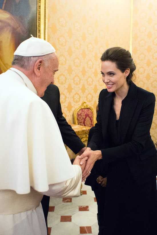 프란치스코 교황이 8일(현지시간) 바티칸에서 여배우 앤젤리나 졸리를 만나 악수를 나누고 있다. 교황은 이날 제2차 세계대전을 소재로 만들어진 영화 '언브로큰'의 바티칸 시사회에 앞서 이 영화를 감독한 졸리를 만났지만 바쁜 일정 때문에 시사회에 참석하지는 않았다. 연합뉴스
