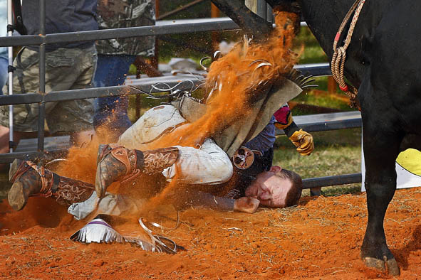 31일(현지시간) 미국 플로리다주 이모캘리의 지역 로데오 경연 도중 한 카우보이가 타고 있던 소에서 떨어지고 있다.연합뉴스