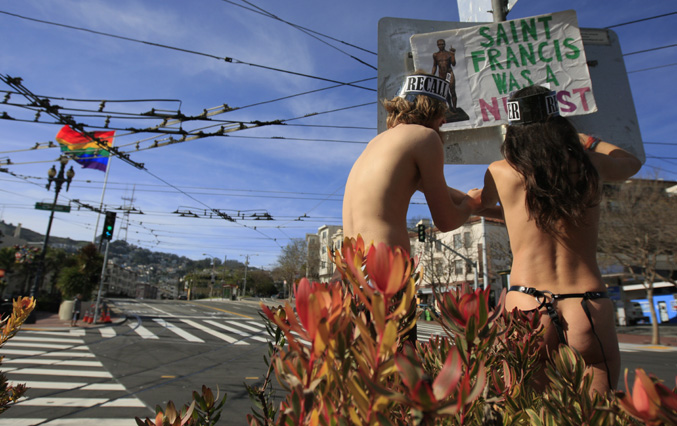 미국 샌프란시스코의 공중 나체금지 조례 제정 2주년인 1일(현지시간) 벌거벗은 두 남녀가 카스트로 구역 광장의 전봇대에 항의 시위를 알리는 포스터를 붙이고 있다.연합뉴스