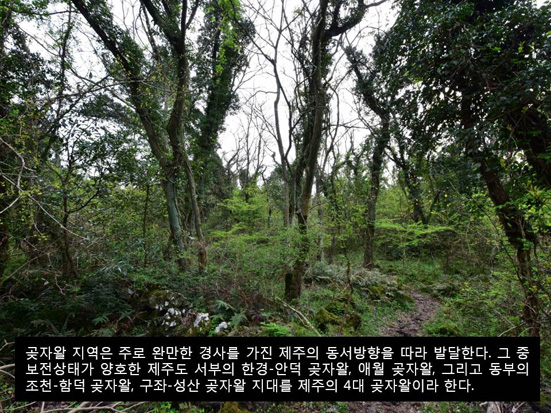 화산분출과 용암활동에 의해 생긴 곶자왈은 수많은 희귀 동식물이 서식하는 생태계의 보고이자 제주의 생명수인 지하수의 저장고로 평가받는다. 곶자왈 지역은 주로 완만한 경사를 가진 제주의 동서방향을 따라 발달한다. 그 중에서 특히 보전상태가 양호한 제주도 서부의 한경-안덕 곶자왈, 애월 곶자왈, 그리고 동부의 조천-함덕 곶자왈, 구좌-성산 곶자왈 지대를 제주의 4대 곶자왈이라 한다.