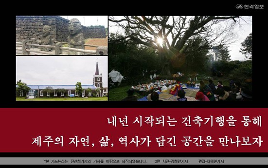 '서귀포 건축기행'은 지역의 건축 자원을 발굴하고 도시의 경쟁력을 높이기 위한 취지로 기획됐다. 서귀포 지역엔 유명 건축가의 작품은 물론 제주 전통건축물, 역사와 이야기가 있는 건축물, 개성넘친 건축물 등 다양한 건축 자원이 모여있다. 해녀 잠수탈의장, 본향당, 성읍민속마을 초가, 강병대교회, 옛 대정면사무소, 월드컵경기장 등 그 빛깔이 다채롭다.