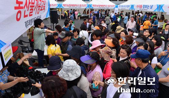 4일 제주시 종합경기장 광장에서 제주특별자치도농업기술원이 주최한 '수다뜰 장보는 날'행사가 열려 많은 시민들이 찾아 안심하고 먹을 수 있는 먹거리를 구입하고 있다. 강희만기자