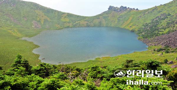 소멸된 제9호 태풍 찬홈의 영향으로 우리나라의 1년치 평균 강수량인 1400mm의 기록적인 폭우가 한라산에 쏟아진 가운데 13일 잠시 걷힌 구름사이로 만수위를 이룬 백록담이 장관이다. 강경민기자