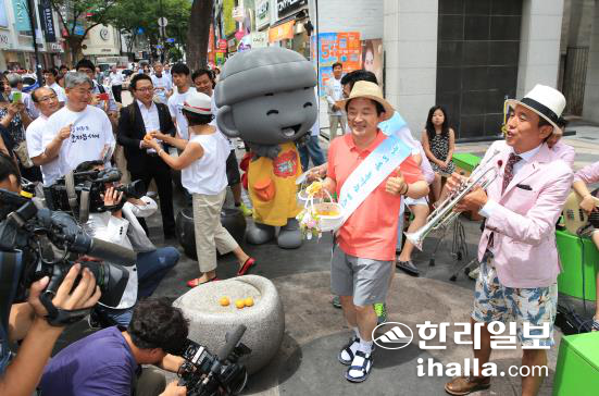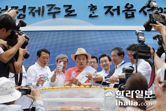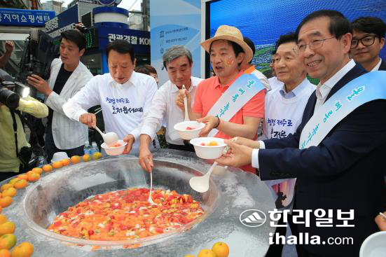 원 지사와 박 시장은 무대에 마련한 대형 화채그릇에 청정제주 과일화채를 만드는 과일화채 나눔 퍼포먼스를 펼친 뒤 홍보부채와 감귤을 나눠주는 거리홍보에 나섰다.