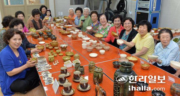 16일 제주시 신성경로당(회장 김권철) 회원들이 노인복지 정책의 일환으로 진행된 취미교실프로그램에서 갈고 닦은 실력을 발휘해 손수 만든 생활도자기를 선보이고 있다. 강경민기자
