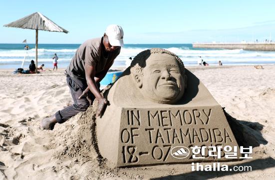 한 조각가가 지난 17일(현지시간) 더반의 한 해변에서 남아프리카공화국 넬슨 만델라 전 대통령의 모래조각 작품을 선보이고 있다.