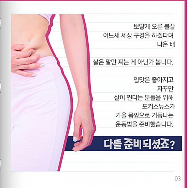뽀얗게 오른 볼살. 어느새 세상 구경을 하겠다며 나온 배. 입맛은 좋아지고 자꾸만 살이 찐다는 분들을 위해 포커스뉴스가 '가을 몸짱'으로 거듭나기 위한 운동법을 카드뉴스로 준비했습니다./장소협찬=타워 피트니스(02-580-2904) 모델=정예진 트레이너[포커스뉴스]
