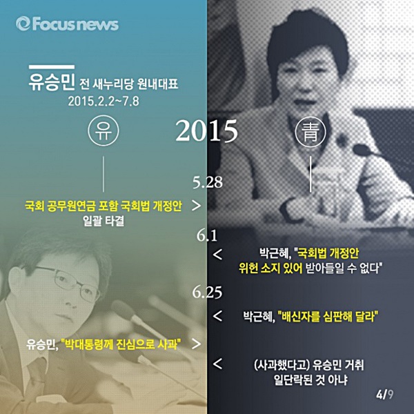 그 동안 청와대와 대립각을 세웠던 인사들은 누가 있었는지, 박 대통령과 김무성 대표와의 악연 등을 카드뉴스를 통해 확인해 보시죠.[포커스뉴스]
