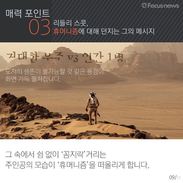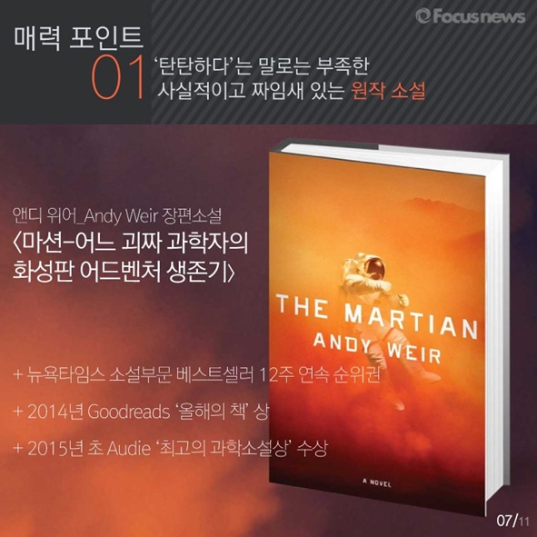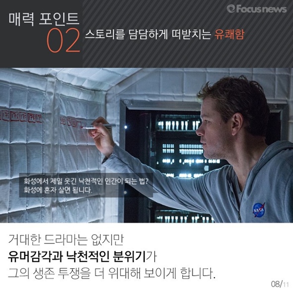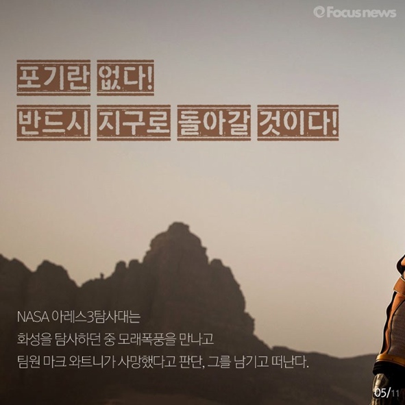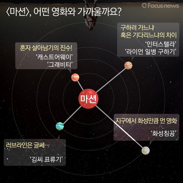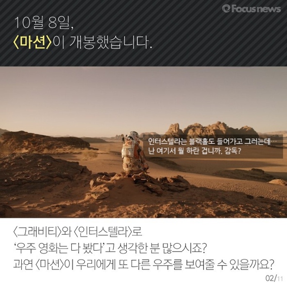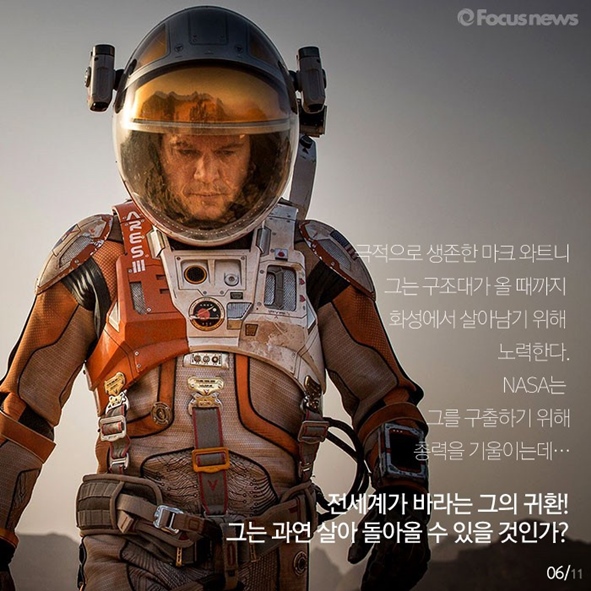 카드뉴스로 그 결정에 도움을 드리겠습니다. 영화 <마션>에 관한 모든 것, 포커스무비에서 알려드립니다.
