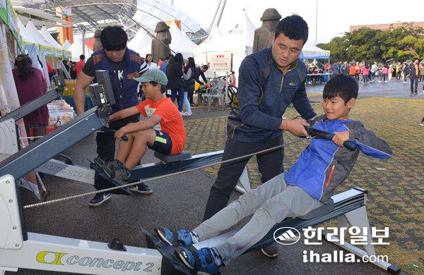 감귤마라톤 행사장을 찾은 달림이들은 출발 전 가볍게 다리 근육을 풀어볼 생각으로 로잉머신을 체험했다. 동반한 가족이나 직장 동료들도 직접 실내 조정 기구에 올라 물 위에서 경기를 하듯 활기찬 동작을 이어갔다.