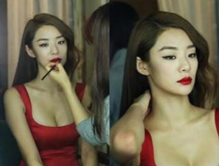 공개된 사진 속에 스테파니 리는 붉은색 드레스를 입고 도도한 표정으로 메이크업을 받고 있다. 드레스와 같은 색은 붉은 립 메이크업과 건강미 넘치는 몸매가 눈길을 끌고 있다.