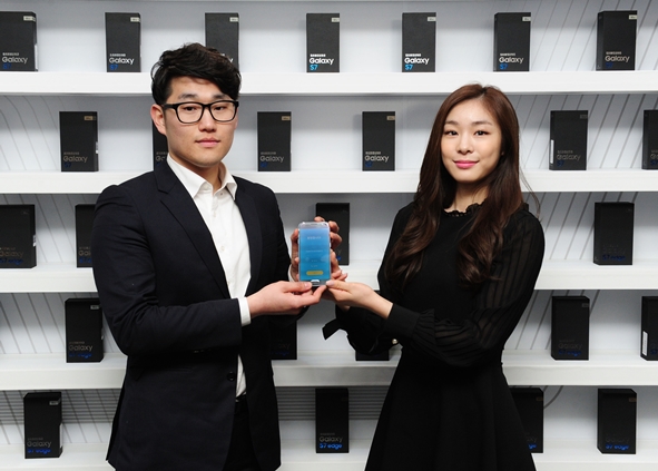 김연아, '갤럭시 S7' 1호 개통고객과 '찰칵'