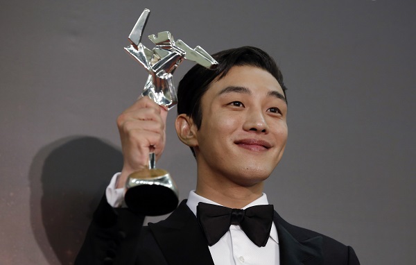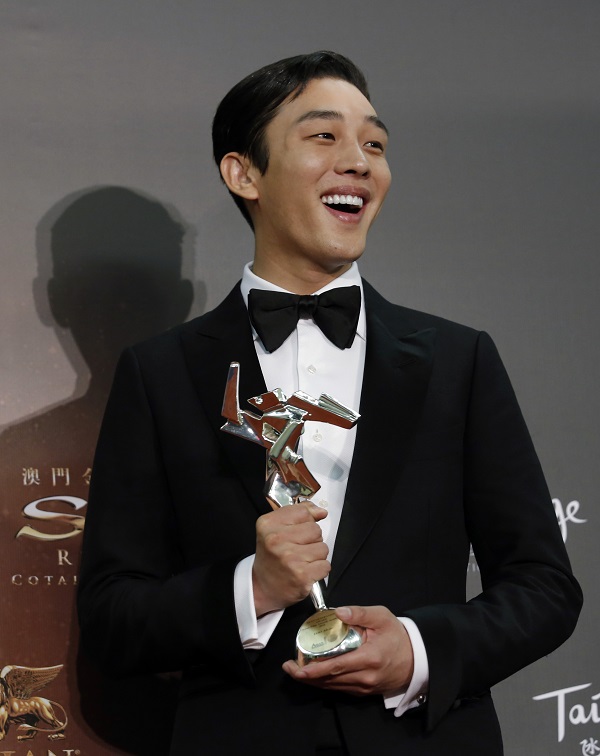 17일(현지시간) 마카오에서 열린 제10회 아시안필름어워즈(AFA)에서 넥스트 제너레이션상을 수상한 배우 유아인이 트로피를 들고 기념촬영을 하고 있다.