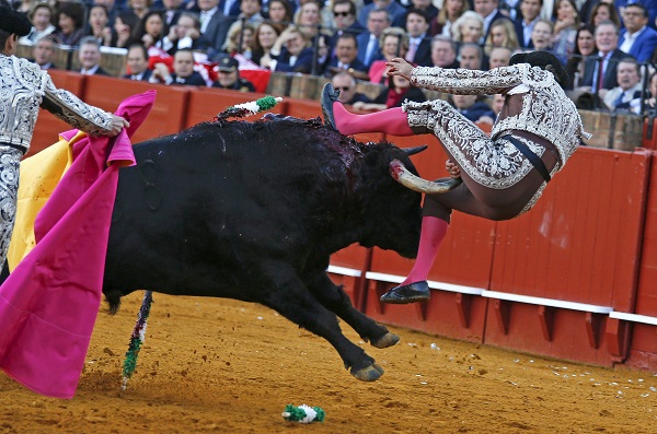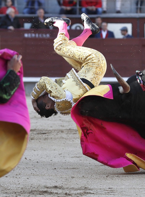 스페인 투우사가 이반 판디노가 27일(현지시간) 스페인 마드리드 벤타스 투우 경기장에서 경기를 펼치던 중 소에 들이받혀 아찔한 상황이 연출됐다.