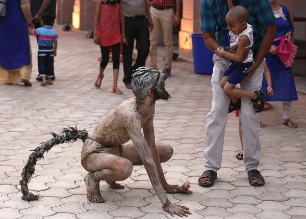 9일(현지시간) 인도 암리차르에서 열린 문화유산 축제 중 한 아이가 원숭이 분장을 한 공연 예술가를 보고 놀라 울고 있다.