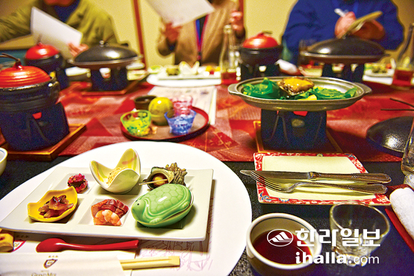 | 아지가사와마을 전통 청어요리를 비롯해 각종 회 전복찜, 눈당근젤리 등이 이어지는 카이세키요리(회석요리). |