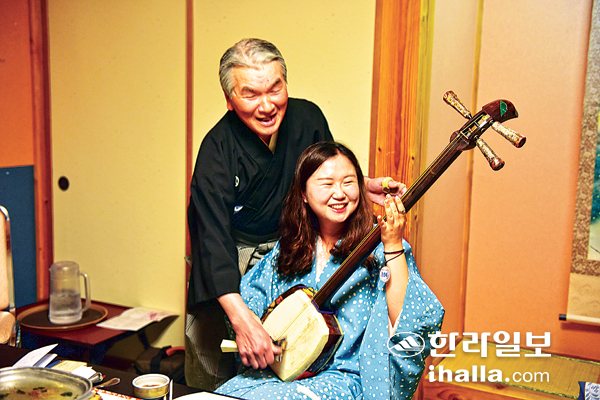 | 팸투어에 참여한 고귀혜씨가 쓰가루샤미센 연주자로부터 샤미센을 연주하는 법을 배우고 있다. |