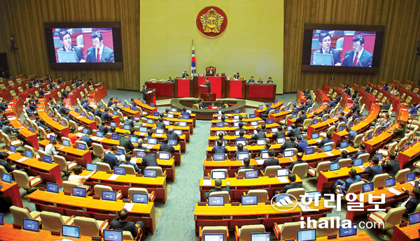 | 지역불균형을 해소하고 특정지역의 전략산업 발전을 위해 그 지역에 한해 맞춤형으로 규제를 푸는 '규제프리존' 법안이 국회를 통과해야 한다는 주장이 설득력을 얻고 있다. 사진은 대정부질문이 이뤄지고 있는 국회본회의장. 연합뉴스 |
