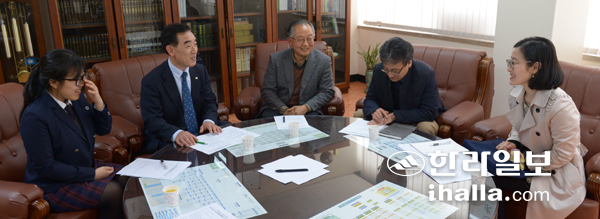 | 최근 한라일보 임원실에서 열린 ‘제주의 가치와 우리의 미래를 말한다'란 주제의 좌담에서 참석자들은 다양한 의견을 자유롭게 개진했다. 사진 왼쪽부터 김민지 학생, 오홍식 회장, 김장환 회장, 박원배 연구위원, 이서현 강사. 강희만기자 |