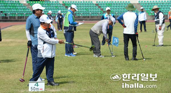 8일 오후 한림종합운동장에서 사전경기로 열린 그라운드 골프 시합 모습. 강희만기자