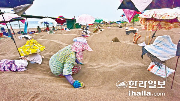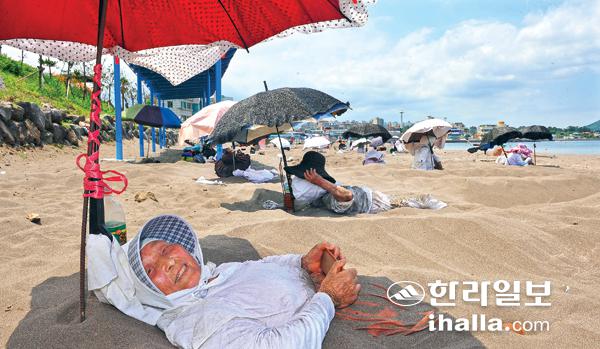 제주시 삼양해수욕장에서 모래뜸질을 하는 모습. 한라일보 DB
