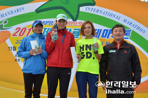 여자부 풀코스 시상식 모습. 사진 왼쪽부터 2위 오혜신, 1위 류승화, 2위 일본 하라코 쿠미코, 강만생 한라일보사 대표이사 사장. 강경민기자