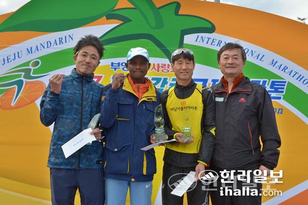 남자부 풀코스 시상식 모습. 사진 왼쪽부터 2위 일본 가자마 가쓰오미, 1위 케냐 조엘 키마루, 3위 최진수, 강만생 한라일보사 대표이사 사장. 강경민기자