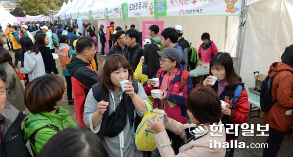 시식 코너도 다양하게 마련됐다. 제주시산림협동조합이 준비한 '표고버섯 죽'과 중국 음식(탕궁훠궈), 홍삼겔(㈜신한에코), 제주맥주(제스피) 등을 무료로 맛볼 수 있는 코너가 차려졌다. 이른 아침 대회에 발걸음 한 이들은 따뜻한 음식을 먹으며 몸을 녹이기도 했다.