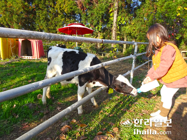 | '아침미소 농원체험목장'에선 푸른 자연 속에서 다양한 체험을 할 수 있다. 송아지에게 우유 주기 체험을 하는 어린이. |