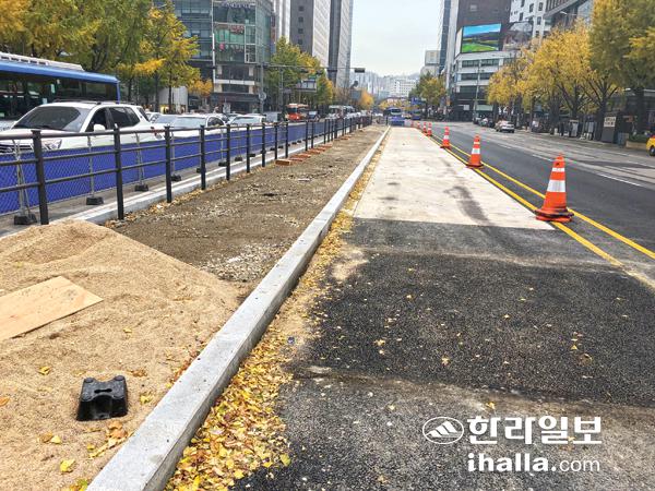 서울시가 지난 2004년 국내에서는 처음으로 버스를 중심으로 하는 대중교통체계를 도입했다. 개편된 대중교통체계는 도입 초기 혼선 같은 일부 부작용에도 불구 시민들의 대중교통 만족도가 급상승하는 등 효과가 확인되며 국내외 지자체들의 벤치마킹 모델이 되고 있다. 사진 왼쪽은 서울시 종로에서 진행되고 있는 버스전용중앙차로 조성 공사. 사진=특별취재팀