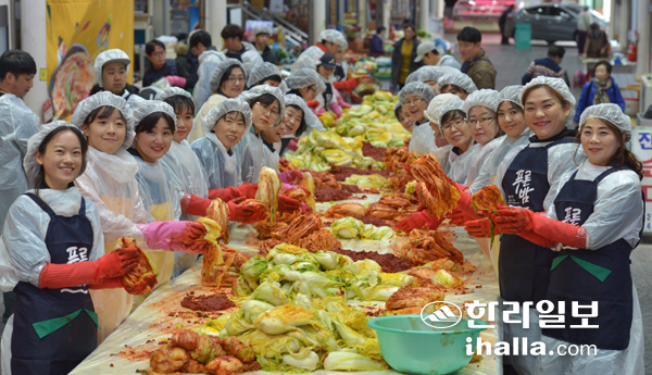 김장김치를 통해 어려운 이웃에게 나눔을 전달하는 행사는 빼놓을 수 없는 연말 이벤트이다. 지난달 30일 서문공설시장 상인회와 이마트 제주점·신제주점, 제주소주, 제주사회복지공동모금회는 '사랑의 김장김치 담그기 행사'를 통해 총 1000포기의 김치를 담갔다. 이날 시장상인들과 이마트점 직원들은 숨죽인 무거운 배추를 옮기고 양념을 버무리고 포장하며 두시간여 동안 구슬땀을 흘렸다. 제주소주 직원들도 시장상인들의 조언을 받으며 정성스럽게 배춧속을 채웠다.