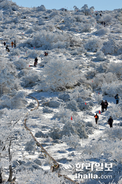 한라산은 국내 전문 산악인들이 히말라야 등 외국 원정을 가기에 앞서 반드시 거쳐가는 겨울철 산악훈련의 메카이다. 허리 높이까지 쌓이는 눈과 거센 눈보라, 영하 20℃를 넘나드는 혹한이 인간의 발길이 닿지 않는 극지의 환경을 만들어내기 때문이다. 특히 올해처럼 쉴 새 없이 눈이 많이 내린 겨울 한라산은 흔치 않은 풍경을 선보이고 있다.