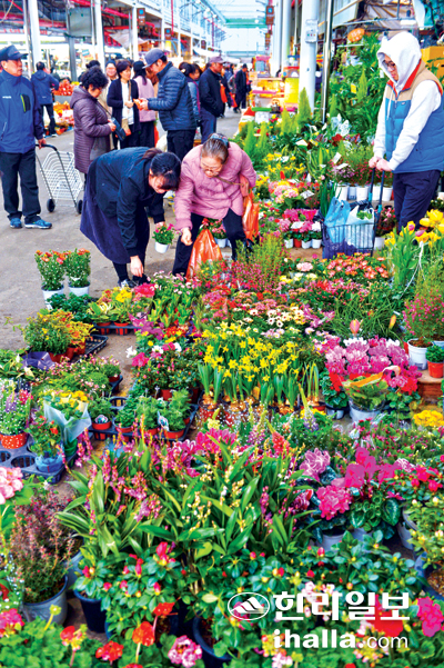 꽃샘추위 체감이 절정이었던 지난 7일 제주시 민속오일장의 꽃시장은 후끈했다. 향긋한 꽃향기에 발이 붙들린 시민들은 그냥 예뻐서 충동적으로, 혹은 새로운 기분을 느끼려고 꽃을 구매했다.