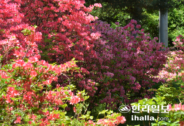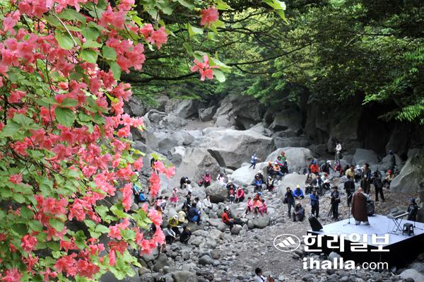 | 요즘 방선문에 가면 푸르른 계곡과 제주의 5월을 대표하는 참꽃이 꽃망울을 터뜨린 모습을 볼 수 있다. |