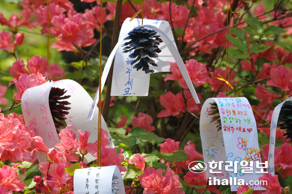 | 지난해 열린 방선문 축제에서 방문객들이 참꽃 사이에 각자의 소원을 적은 종이를 걸어 놨다. |
